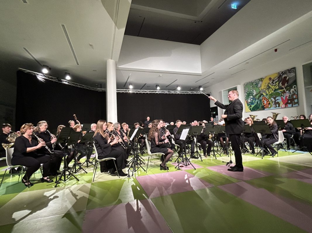 Michael Werner schwang nicht nur gekonnt seinen Taktstock, sondern führte auch als Conferencier mit Witz und Wissen durch eine musikalische Zeitreise, die durch den nuancierten Einsatz lauter und leiser Töne, taktgenaue Tempi und viel Spielfreude bestach, beim Auftakt mit den festlich-forschen Fanfarenklängen aus dem Feierlichen Chor der Hamburger Admiralitätsmusik (1730) von Georg Philipp Telemann, ebenso wie bei der dramatischen Originalkomposition „Titanic“ von Stefan Jaeggi (1921) oder der viersätzigen Second Suite in F von Gustav Holst (1911) , einem Klassiker konzertanter Blasmusik, in dem sich Folksong-Melodien zu einem reizvollen Klangteppich verweben. Einen besonderen Höhepunkt stellte Korinna Gonschoreks mitreißendes, melodisch-tänzerisches Klarinettensolo mit der Filmmusik des Kinoerfolgs „The Terminal“ dar.