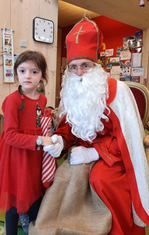 Schon am Morgen erfüllten fröhliche Kinderstimmen das Haus. Zu den bekannten Liedern „Lasst uns froh und munter sein“, „heut ist Nikolausabend da“ wurde gesungen und getanzt. Die Vorschulkinder trugen mit Stolz ein Gedicht vor, das sie im Vorfeld fleißig einstudiert hatten. Der Nikolaus wanderte von Gruppe zu Gruppe und wurde überall mit Spannung erwartet. Im Stuhlkreis wurde es plötzlich ganz still: Die Kinder lauschten gebannt einer Geschichte aus dem Leben des heiligen Nikolaus, die er ihnen persönlich erzählte. Anschließend öffnete er sein großes goldenes Buch. Zu jedem einzelnen Kind wusste er liebevolle Worte – von den kleinen und großen Dingen, die seine „Englein“ ihm berichtet hatten. Dabei lobte er viel Gutes, sprach aber auch sanfte Wünsche zur Besserung aus, ganz im Sinne seiner wertschätzenden und warmherzigen Art.