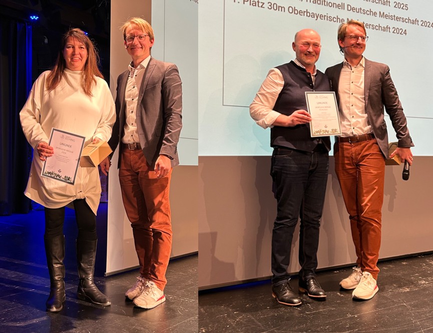 Zur diesjährigen Sportlerehrung der Gemeinde konnte der Schützenverein gleich zwei Schützen schicken. Andrea Breitenfeld hatte 2024 bei der Bayrischen Meisterschaft mit der Armbrust den 1. Platz belegt. Anton Kurz 2025 bei der Deutschen Meisterschaft den 2. Platz ebenfalls mit der Armbrust.