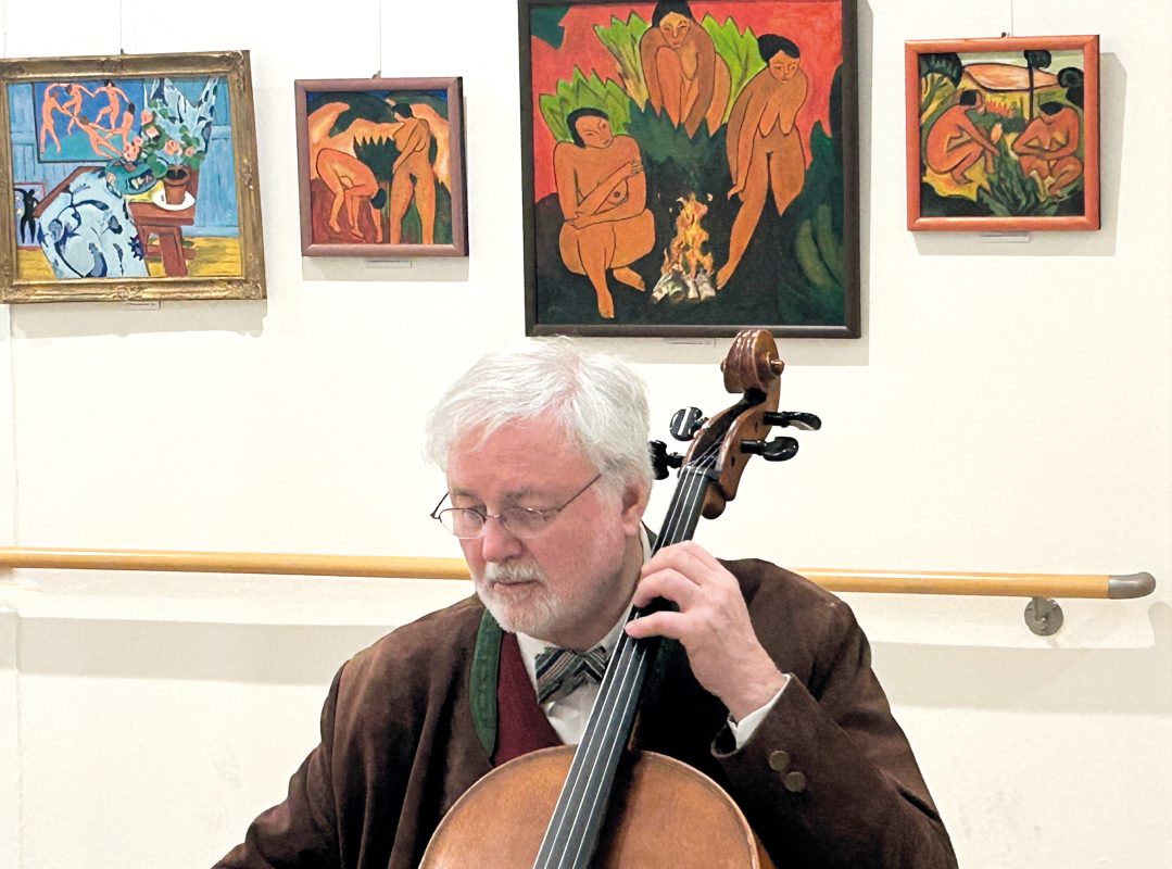 Er spielte Cello im Streicherquartett „Gilamare“, der vielseitige Künstler Rudolf Rehbach bei der Vernissage der eigenen Kunstausstellung im Echinger Alten- und Servicezentrum.