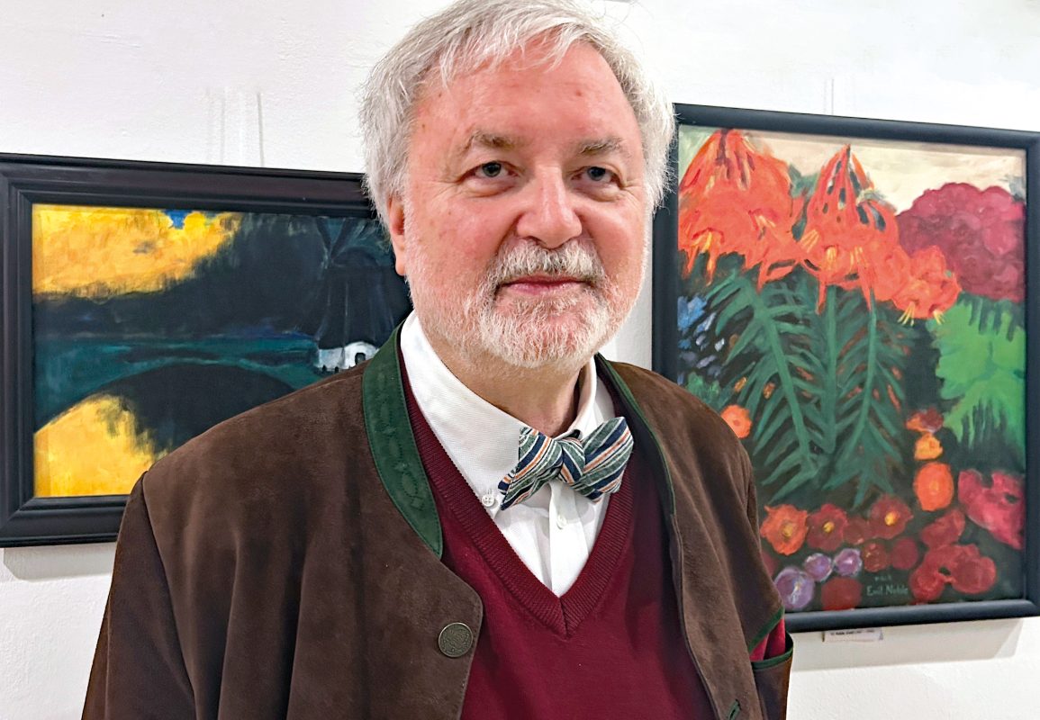 Rudolf Rehbach vor zwei seiner Emil Nolde nachempfundenen Bilder.